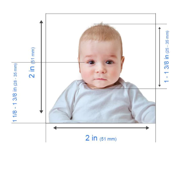 If you are applying in person or by mail, your photo should be 2”x 2” (51 x 51 mm) with the head centered and sized between 1” and 1.4” (25 and 35 mm).